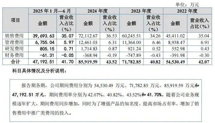 对比来看,2022年至2024年以及2025年上半年,英氏控股发卖费用别离为4。54亿元、6。02亿元、7。21亿元和3。97亿元,三年半合计21。74亿元,约占停业收入的35%,为研发费用的54倍。
