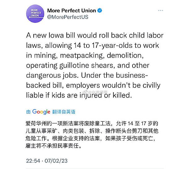 好比爱荷华州拔除了童工法,答应14岁到17岁的儿童处置采矿、肉类包拆、拆除、操做断头台铰剪和其它工做,而若是儿童正在工做中受伤或灭亡,雇从不消承担任何义务。