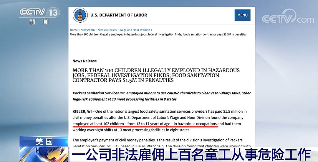 所谓的中国、劳动话术,这是美国为了中国、搞乱中国所的惊世假话,所打出的一个灯号。美国本地时间2月17日,美国劳工部颁布发表,正在美国一大型食物平安卫生办事供应商处出发觉至多102名13至17岁童工被不法雇佣、处置工做。